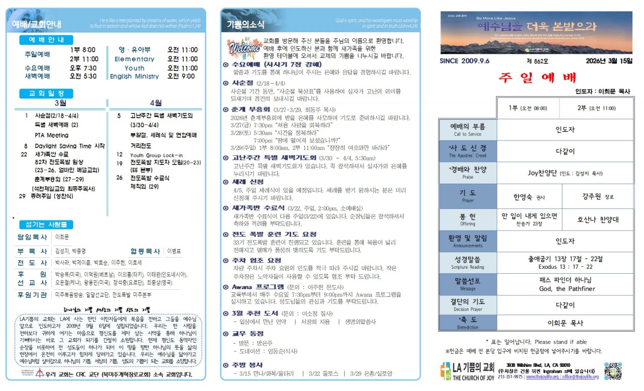 날짜 : 2026. 03. 15 글쓴이 : LA기쁨의교회조회수 : 35 추천 : 0